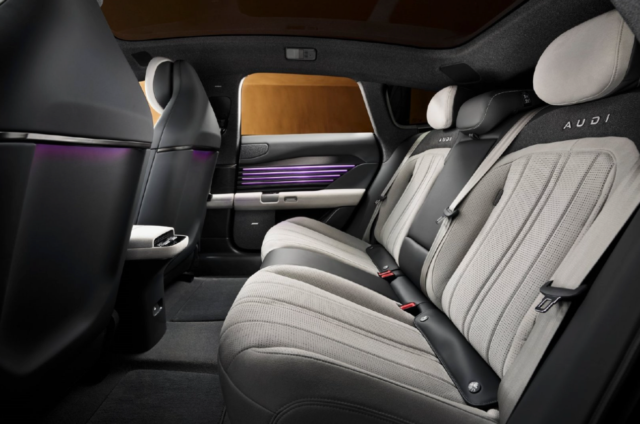 奥迪E5 Sportback的内饰延续了德系豪华的细腻水准,12.3英寸全液晶仪表盘+12.3英寸MMI触控中控屏+抬头显示的“三屏联动”,科技感与实用性兼顾。用料上诚意十足,大面积真皮、Alcantara材质和金属饰条包裹,触感细腻,缝线工整,每一处细节都透着豪华品牌的积淀。空调出风口采用隐藏式设计,搭配氛围灯,夜晚点亮时氛围感拉满;座椅填充厚实,支持多向电动调节和加热功能,长途乘坐也不会觉得疲惫。