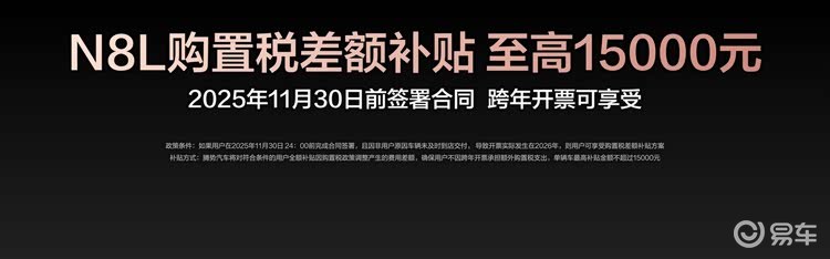 为回馈广大用户的支持与信赖,腾势N8L特别推出限时购车权益,权益价值至高10.67万元!包括价值1.7万元的三年免息,最高1万元的置换补贴。此外,不必担心因为交车晚,享受不到购置税补贴:在2025年11月30日24点前完成合同签署的用户,如果因非用户原因车辆未及时交付,导致开票实际发生在2026年,可享受购置税差额补贴,最高1.5万元!
