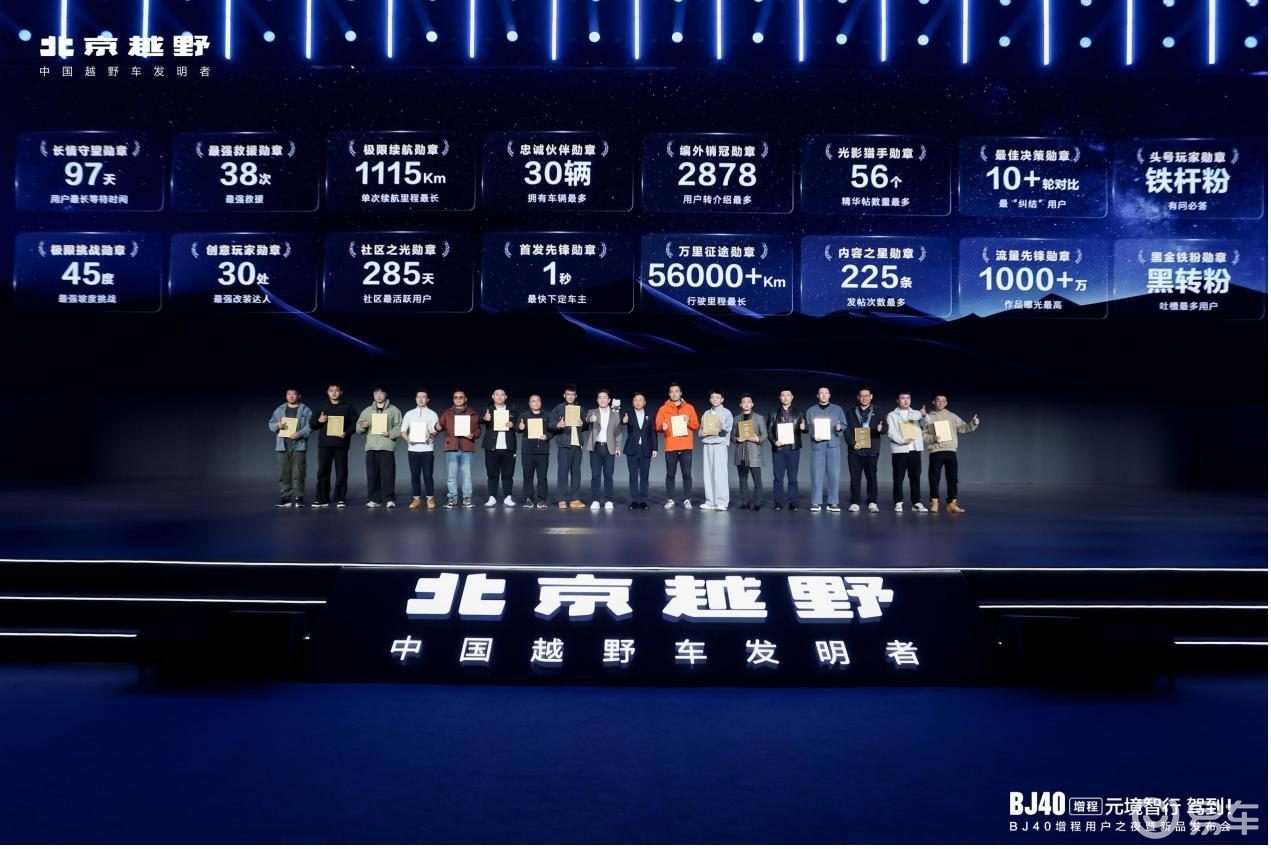 北汽集团董事长张建勇为BJ40增程“车主之最”用户颁奖。16位获奖用户包括等车时间最久用户、行驶里程最长用户、一箱油单次跑出最远里程用户等,他们用一个个动人的故事,让BJ40增程不仅仅是一台车,更成为一种文化,一种精神符号。