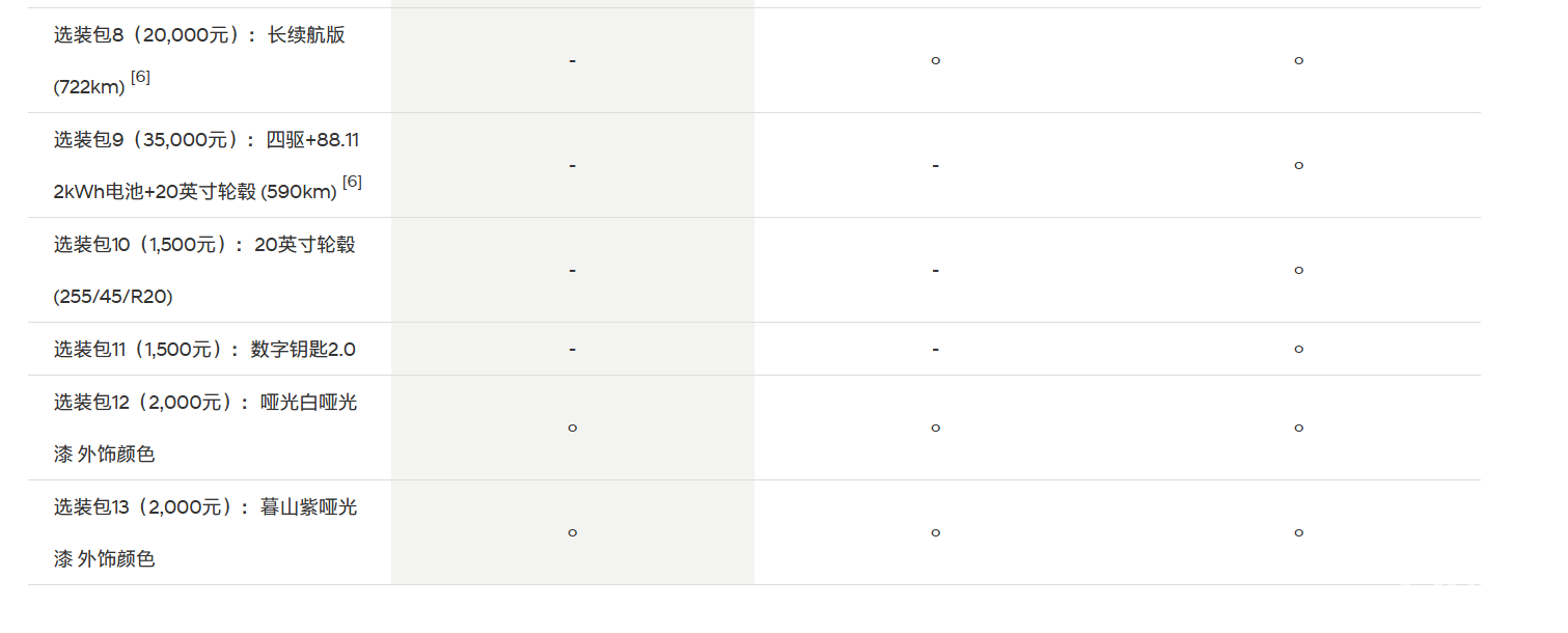 另外,如果觉得动力和续航还不够,其实官方还给了选装包可选,比如选大电池版,CLTC续航能达到722km(20000元),又比如四驱+大电池+20英寸轮毂(35000元)等等。这里吐槽一下,新车的中低配并没有热泵空调,这个和220V后备箱电源一起选装的话要2000元,要知道热泵空调在国产车上都是标配。下面直接看具体的配置: