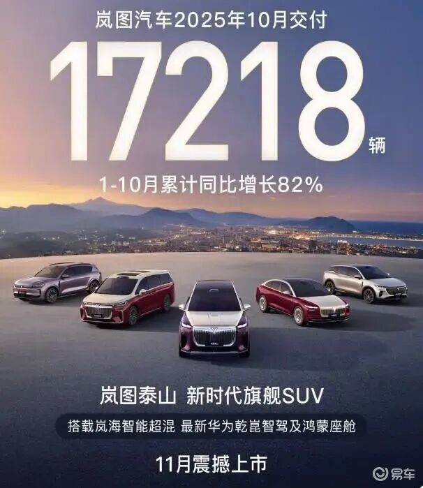 - 岚图汽10月交付达17218辆,实现九连涨”,冲刺30万